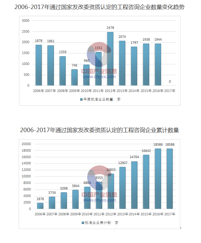 2006年開(kāi)始,國(guó)家發(fā)改委開(kāi)展工程咨詢(xún)單位資格認(rèn)定工作。2005年之前發(fā)改委原頒發(fā)的臨時(shí)級(jí)、預(yù)備級(jí)、丙級(jí)工程咨詢(xún)資格證書(shū)有效期截止至2005年12月31日,需要重新申請(qǐng)工程咨詢(xún)資格。持有正式甲、乙級(jí)工程咨詢(xún)資格證書(shū)的單位,2006年另行申請(qǐng)工程咨詢(xún)資格。因此此處統(tǒng)計(jì)口徑主要是2006年以來(lái)通過(guò)國(guó)家發(fā)...
